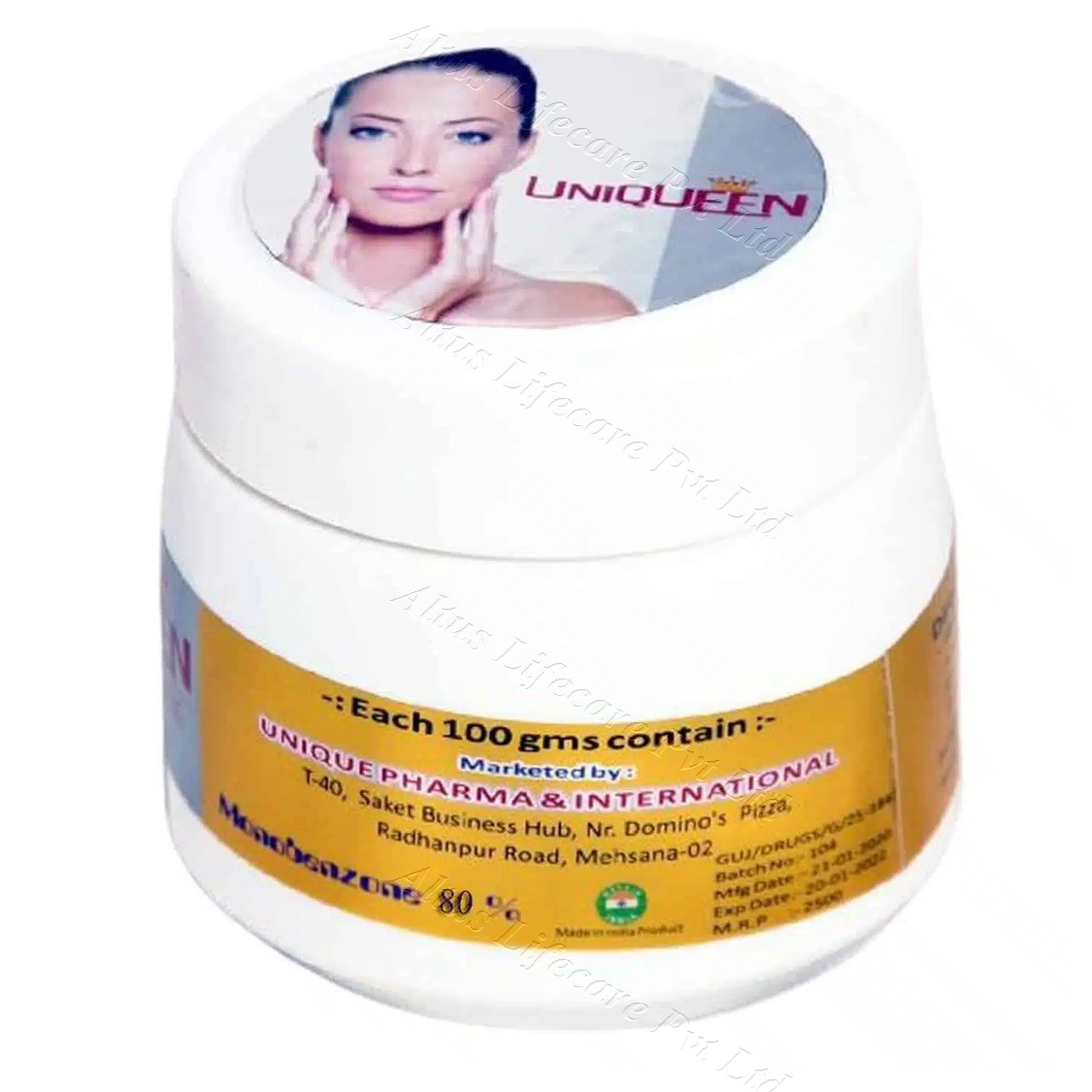 Uniqueen 80 Cream is a high-strength depigmenting topical medication specially formulated for patients suffering from extensive vitiligo. It contains Monobenzyl Ether of Hydroquinone (MBEH) 80%, a powerful agent used for permanent depigmentation therapy to achieve a uniform skin tone.